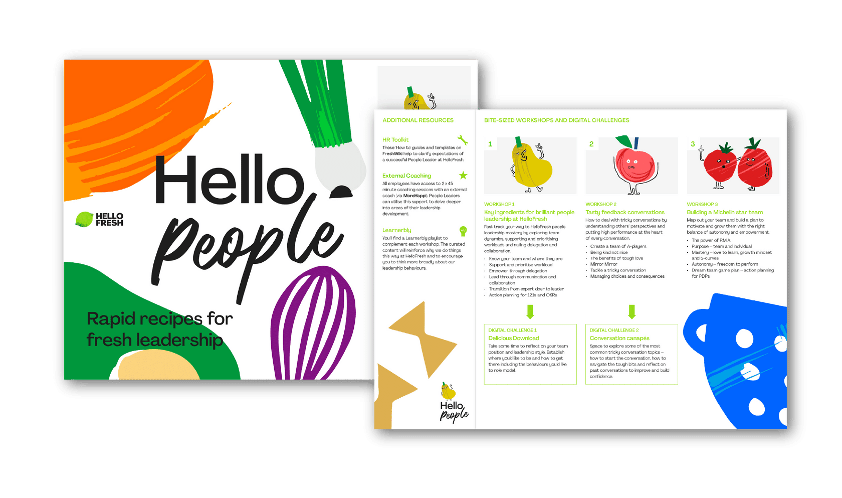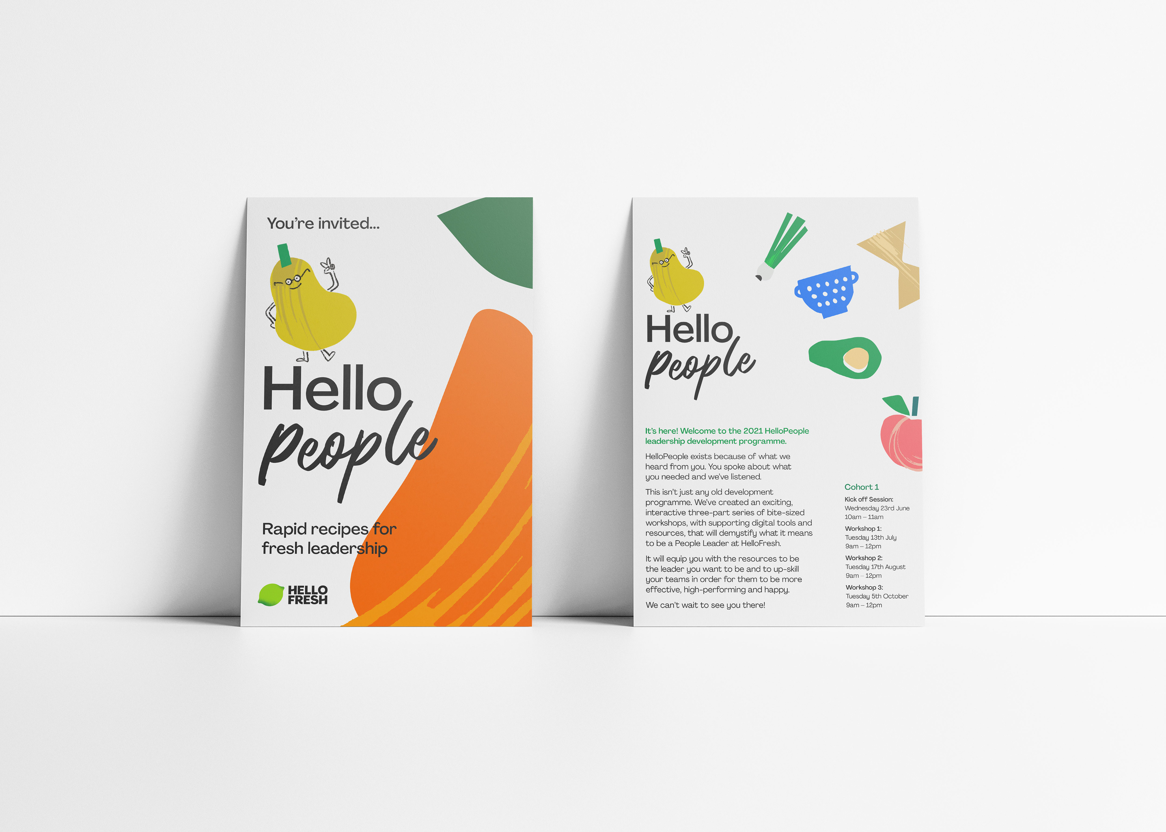 Working within the existing brand, a playful visual language was developed using custom fruit and vegetable characters to bring warmth and personality to the experience. The system extended across learning materials, internal communications and programme content, creating a distinctive and engaging identity.